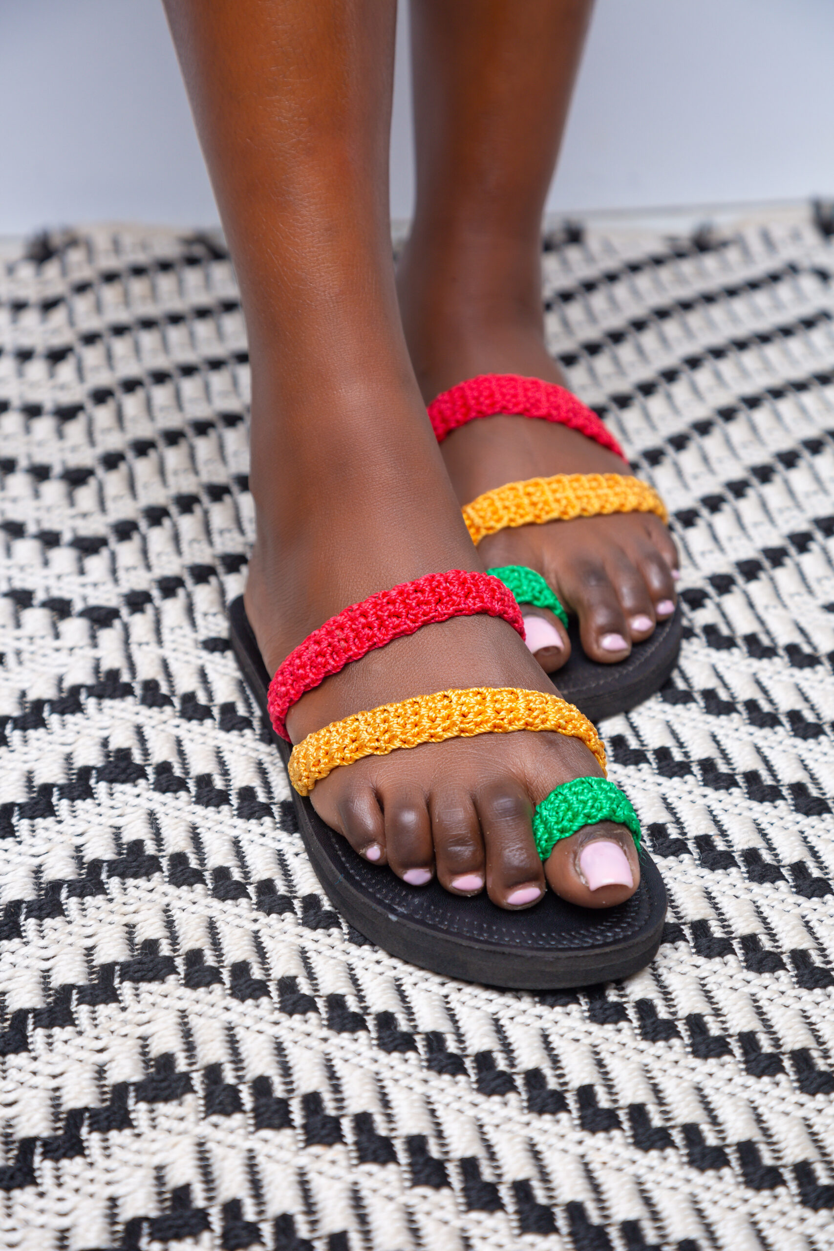 Step into vibrant style with these eye-catching sandals, perfect for a sunny day. The unique, hand-knitted straps in bright red and yellow add a pop of color to any outfit, while the green toe ring offers an playful touch.